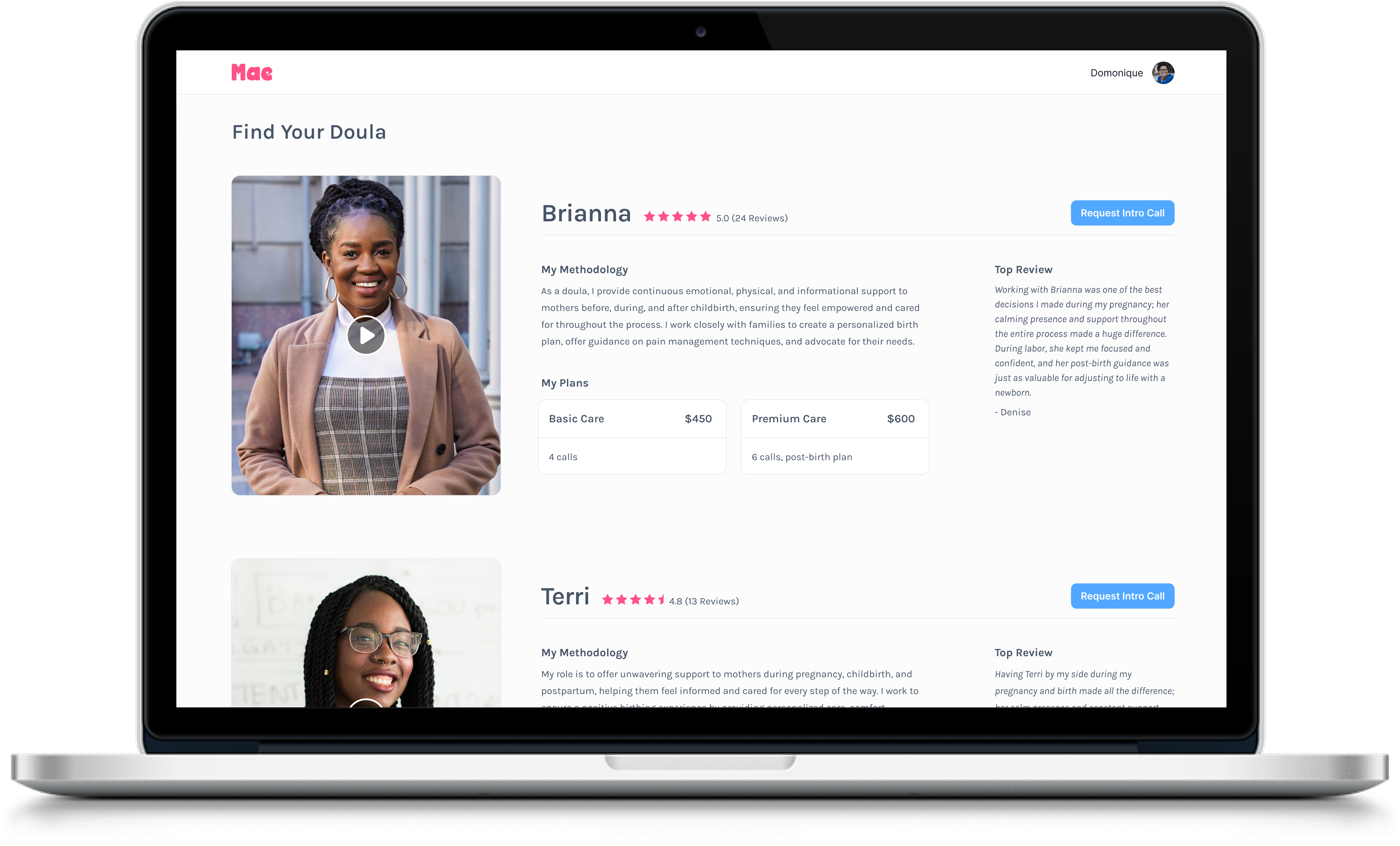 Since video was the primary introduction method, we aimed to make it a central feature. Mothers would be presented with key information about each doula, and a 1-minute video where the doula introduces herself. Users could easily book an intro call to assess compatibility and take the next step in their journey together.